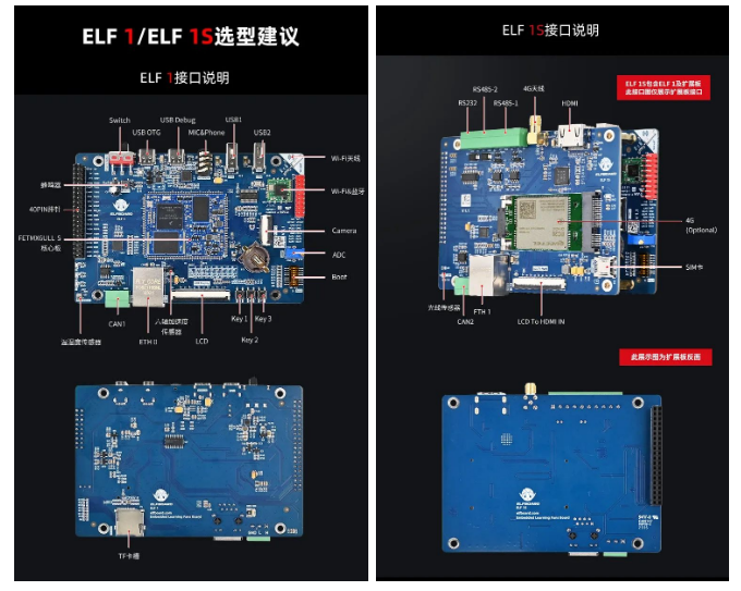 ELF 1S的接口、模塊和傳感器非常豐富,學(xué)習(xí)中常用的CAN、Wi-Fi&BT、音頻、USB、Camera、LCD顯示、溫濕度傳感器、HDMI、RS232、RS485、4G模塊等等都有配備,這里就不一一展開去講了,大家可以看官方的接口圖。