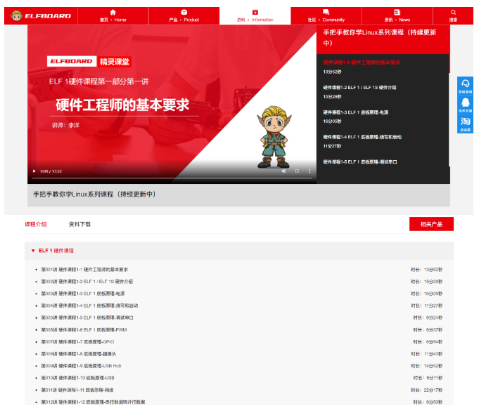 作為一款面向?qū)W習(xí)者使用的板卡,課程和資料是必不可少的。在ElfBoard的官網(wǎng)上,我們可以看到持續(xù)推送更新的產(chǎn)品學(xué)習(xí)視頻,從硬件到軟件,從基礎(chǔ)學(xué)習(xí)到進(jìn)階開發(fā)視頻課程都有。