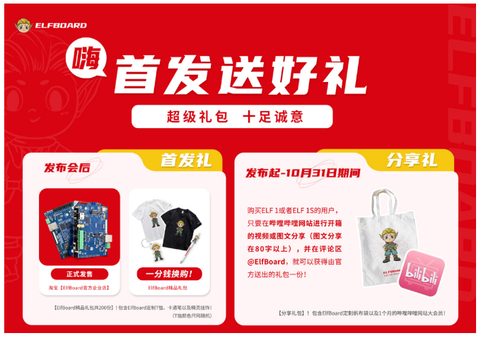 目前,ElfBoard官方企業(yè)店(淘寶)購買ELF 1系列產(chǎn)品可享88折優(yōu)惠,并且還可以0.01元搶首發(fā)禮包,結(jié)合產(chǎn)品值得稱贊的產(chǎn)品力,這個價格配合活動可以說是很良心了。