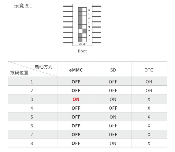 1、首先要確認啟動方式。選擇從eMMC啟動,將開發(fā)板撥碼開關(guān)撥到序號3為ON;其余為OFF。