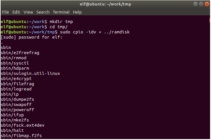 elf@ubuntu:~/work$?mkdir tmpelf@ubuntu:~/work$?cd tmp/elf@ubuntu:~/work/tmp$ sudo cpio -idv < ../ramdisk