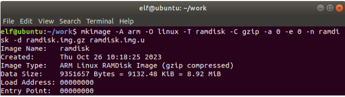 elf@ubuntu:~/work$?mkimage -A arm -O linux -T ramdisk -C gzip -a 0 -e 0 -n ramdisk -d ramdisk.img.gz ramdisk.img.u