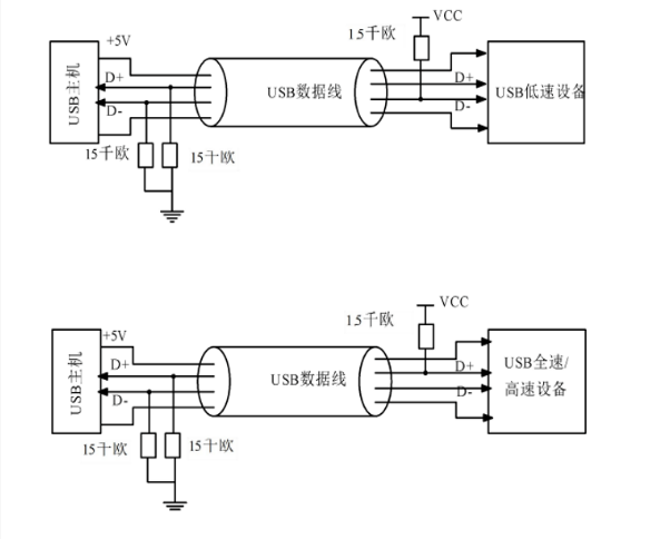 首先,全速和低速很好區(qū)分:因為在設(shè)備端有一個 1.5K 的上拉電阻,當(dāng)設(shè)備插入控制器或上電時,有上拉電阻的那根數(shù)據(jù)線就會被拉高,控制器根據(jù) D+/D-上的電平判斷所掛載的是全速設(shè)備還是低速設(shè)備。全速設(shè)備D+端有1.5K上拉電阻,低速設(shè)備D-端有1.5K上拉電阻。
