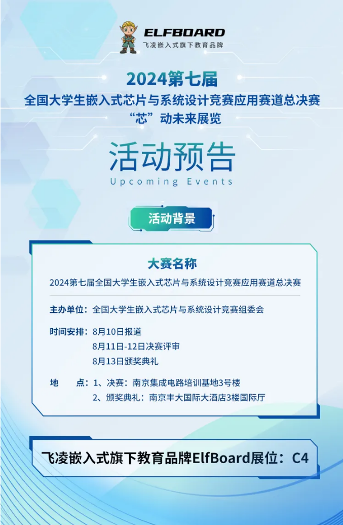 2024第七屆全國大學(xué)生嵌入式芯片與系統(tǒng)設(shè)計(jì)競賽的應(yīng)用賽道總決賽——“芯”動未來展覽,將于8月11日至13日在南京集成電路培訓(xùn)基地及南京豐大國際酒店盛大舉行。屆時,飛凌嵌入式旗下教育品牌ElfBoard也將參與其中,共同推動產(chǎn)學(xué)研合作及成果的轉(zhuǎn)化。