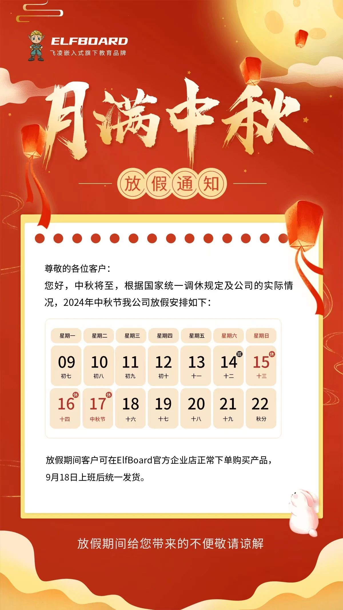 自9月15日至9月17日,共計3天。在此期間,客戶可在ElfBoard官方企業(yè)店正常下單購買產(chǎn)品。