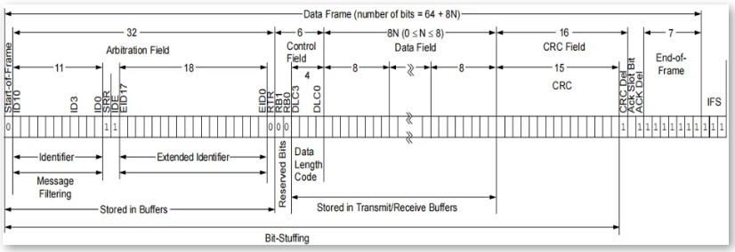 為滿足不同通信需求,CAN協(xié)議定義了多種幀類型,包括數(shù)據(jù)幀、遠(yuǎn)程幀、錯(cuò)誤幀、過載幀、幀間隔等。數(shù)據(jù)幀用于傳輸數(shù)據(jù),包含實(shí)際的有效數(shù)據(jù)內(nèi)容;遠(yuǎn)程幀用于請(qǐng)求數(shù)據(jù),沒有數(shù)據(jù)部分,只發(fā)送標(biāo)識(shí)符和長(zhǎng)度信息;錯(cuò)誤幀用于指示總線上的錯(cuò)誤,幫助進(jìn)行錯(cuò)誤處理;過載幀用于指示總線過載,幫助管理數(shù)據(jù)流;幀間隔是兩幀之間的時(shí)間間隔,用于確保幀的正確傳輸,避免幀沖突。其中最常見的幀類型是數(shù)據(jù)幀,分為標(biāo)準(zhǔn)數(shù)據(jù)幀和擴(kuò)展數(shù)據(jù)幀。
