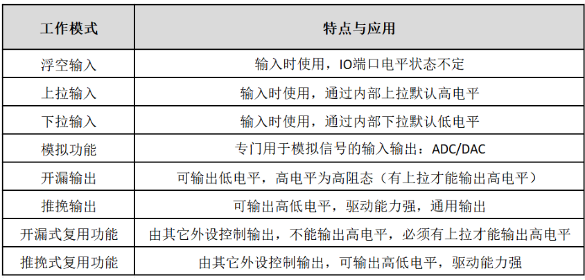 GPIO引腳可以被配置為輸入或輸出模式,工作模式主要有8種,如下表所示: