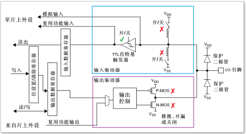其特點(diǎn)是可以輸出高電平和低電平,并且有較強(qiáng)的驅(qū)動(dòng)能力。使用推挽輸出,電路內(nèi)部的上拉電阻和下拉電阻通常處于關(guān)斷狀態(tài),施密特觸發(fā)器打開,NMOS管和PMOS管由內(nèi)部寄存器控制導(dǎo)通或者不導(dǎo)通的狀態(tài)。?