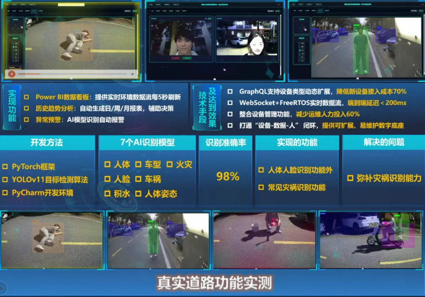 其中,武漢職業(yè)技術(shù)大學(xué)“提瓦特小分隊(duì)”團(tuán)隊(duì)?wèi){借參賽項(xiàng)目“靈眸天樞-多模態(tài)協(xié)同智慧燈桿系統(tǒng)”,榮獲全國(guó)一等獎(jiǎng)。該團(tuán)隊(duì)由光電與信息工程學(xué)院的吳夢(mèng)飛、王功欽、李彥碩三位同學(xué)組成,并在王晉偉老師和劉瓊老師的指導(dǎo)下完成項(xiàng)目。接下來(lái),讓我們一起了解這一獲獎(jiǎng)項(xiàng)目的具體內(nèi)容。