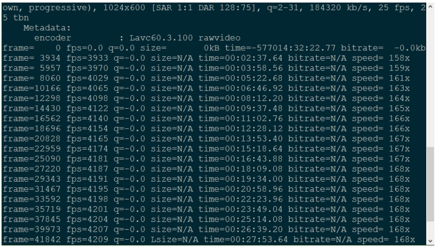 root@elf2-desktop:~# ffmpeg -f lavfi -i smptebars=size=1024x600 -pix_fmt yuv420p -f v4l2 /dev/video21