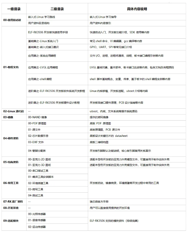 不僅如此,開發(fā)板附帶了系統(tǒng)而全面的課程資料,包括:教程文檔、Linux內(nèi)核源代碼、系統(tǒng)鏡像、硬件資料、RK原廠工具與文檔,以及完整的開發(fā)環(huán)境。這些資源完整覆蓋了嵌入式Linux的開發(fā)全流程,能有效幫助高校師生及個人學(xué)習(xí)者快速入門并掌握相關(guān)開發(fā)技能。