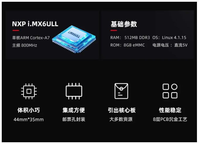 ELF 1系列采用的主控是NXP i.MX6ULL處理器,也算是板卡里面的經(jīng)典主控了,很多廠商都在用,產(chǎn)品穩(wěn)定、民間資料多,不用發(fā)愁產(chǎn)品偏門找不到輔助資料。另外這款產(chǎn)品提供的是512MB的RAM和8GB的ROM,可以運(yùn)行Linux 4.1.15。