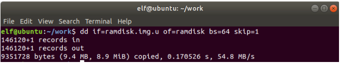 elf@ubuntu:~/work$?dd if=ramdisk.img.u of=ramdisk bs=64 skip=1