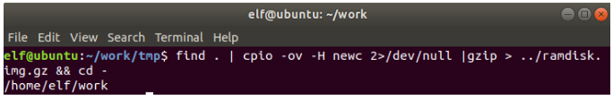 elf@ubuntu:~/work/tmp$?find . | cpio -ov -H newc 2>/dev/null |gzip > ../ramdisk.img.gz && cd -