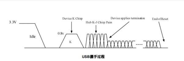 高速設(shè)備看到復(fù)位信號后,通過內(nèi)部的電流源向D-線持續(xù)灌一個小電流,加上內(nèi)部的等效阻抗近似于45R,所以在控制端可以看到一個約800mV的電壓,這就是?Chirp K 信號(由設(shè)備發(fā)起)。