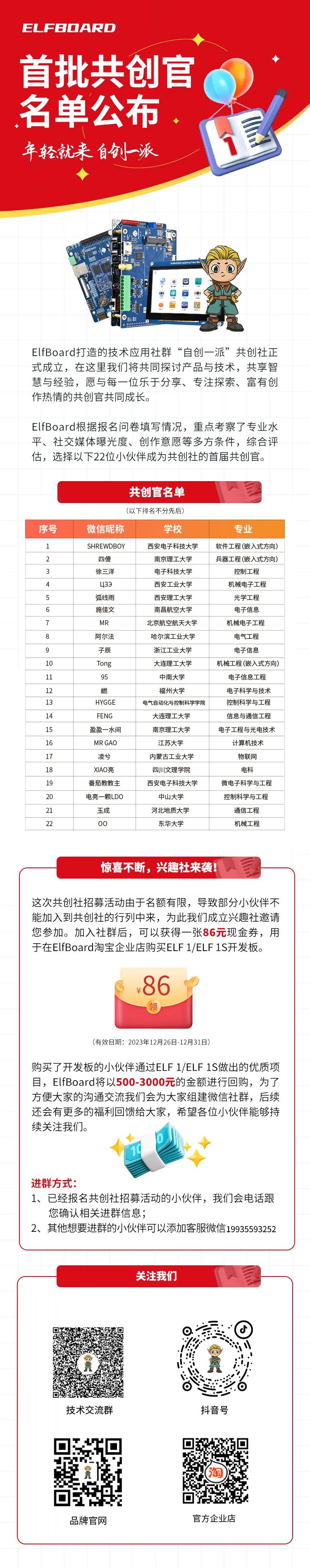 ElfBoard打造的技術應用社群“自創(chuàng)一派”共創(chuàng)社正式成立,在這里我們將共同探討產(chǎn)品與技術,共享智慧與經(jīng)驗,愿與每一位樂于分享、專注探索、富有創(chuàng)作熱情的共創(chuàng)官共同成長。