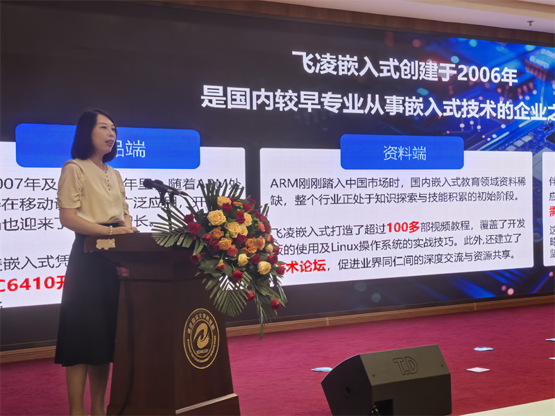 為促進(jìn)高校、科研機(jī)構(gòu)與企業(yè)之間的深入交流與合作,保定大學(xué)科技園特別舉辦產(chǎn)教研賽融合研討會,共同探索新技術(shù)、新產(chǎn)品,推動科技成果的轉(zhuǎn)化和應(yīng)用。飛凌嵌入式教育事業(yè)部總監(jiān)在研討會上分享了“嵌入式教育新體驗(yàn)”,她首先回顧了2023年飛凌嵌入式宣布重新回歸嵌入式教育市場的重要決策,并為此創(chuàng)立了旗下教育品牌“ElfBoard”,之后詳細(xì)闡述了“ElfBoard”的品牌愿景,希望將企業(yè)的實(shí)踐經(jīng)驗(yàn)與高校的理論研究相結(jié)合,共同構(gòu)建一個(gè)既注重理論基礎(chǔ)又強(qiáng)調(diào)實(shí)踐操作的嵌入式教育生態(tài)系統(tǒng)。