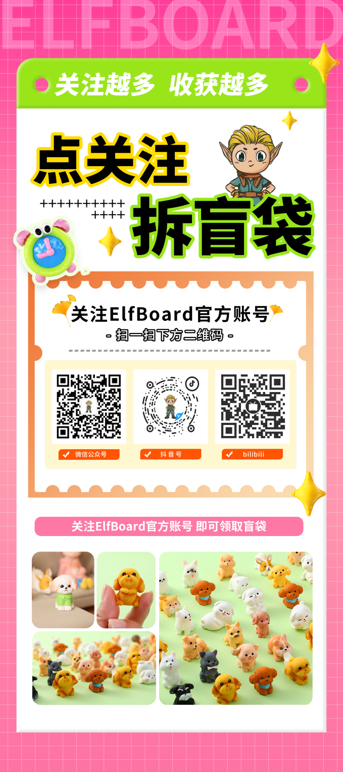 在展會現(xiàn)場,ElfBoard將舉辦“點(diǎn)關(guān)注,拆盲袋”的活動。所有到場的觀眾只需關(guān)注ElfBoard社交媒體平臺的官方賬號,即可獲得盲袋禮品,關(guān)注平臺越多,領(lǐng)取的禮品也越多。誠邀各位朋友蒞臨C4展位積極參與。