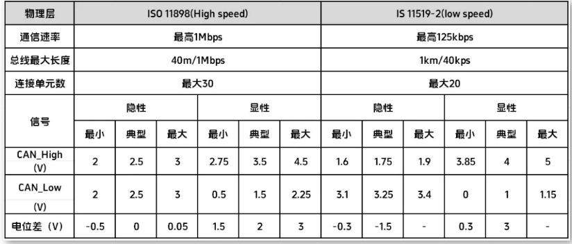 CAN協(xié)議經(jīng)過ISO標(biāo)準(zhǔn)化后有兩個(gè)標(biāo)準(zhǔn):ISO11898標(biāo)準(zhǔn)和ISO11519-2標(biāo)準(zhǔn);其中標(biāo)準(zhǔn)ISO11519-2-1994已經(jīng)被ISO11898-3-2006 代替,即符合標(biāo)準(zhǔn)ISO11898-3的產(chǎn)品也是符合ISO11519-2標(biāo)準(zhǔn)的產(chǎn)品;ISO11898-2-2016更新并替代了ISO11898-2:2003,ISO11898-5:2007和ISO11898-6:2013。ISO11898標(biāo)準(zhǔn)和ISO11519-2標(biāo)準(zhǔn)對(duì)于數(shù)據(jù)鏈路層的定義相同,但物理層不同,兩個(gè)標(biāo)準(zhǔn)間的差異如下: