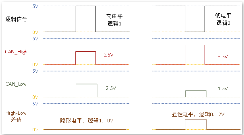 當(dāng)CAN收到一個(gè)低電平信號(hào),CAN_High輸出3.5V,CAN_Low輸出1.5V,兩者的電壓差是2V,此時(shí)表示邏輯0,也稱顯性電平。