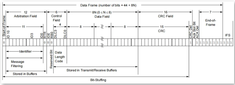 為滿足不同通信需求,CAN協(xié)議定義了多種幀類型,包括數(shù)據(jù)幀、遠(yuǎn)程幀、錯(cuò)誤幀、過載幀、幀間隔等。數(shù)據(jù)幀用于傳輸數(shù)據(jù),包含實(shí)際的有效數(shù)據(jù)內(nèi)容;遠(yuǎn)程幀用于請(qǐng)求數(shù)據(jù),沒有數(shù)據(jù)部分,只發(fā)送標(biāo)識(shí)符和長(zhǎng)度信息;錯(cuò)誤幀用于指示總線上的錯(cuò)誤,幫助進(jìn)行錯(cuò)誤處理;過載幀用于指示總線過載,幫助管理數(shù)據(jù)流;幀間隔是兩幀之間的時(shí)間間隔,用于確保幀的正確傳輸,避免幀沖突。其中最常見的幀類型是數(shù)據(jù)幀,分為標(biāo)準(zhǔn)數(shù)據(jù)幀和擴(kuò)展數(shù)據(jù)幀。