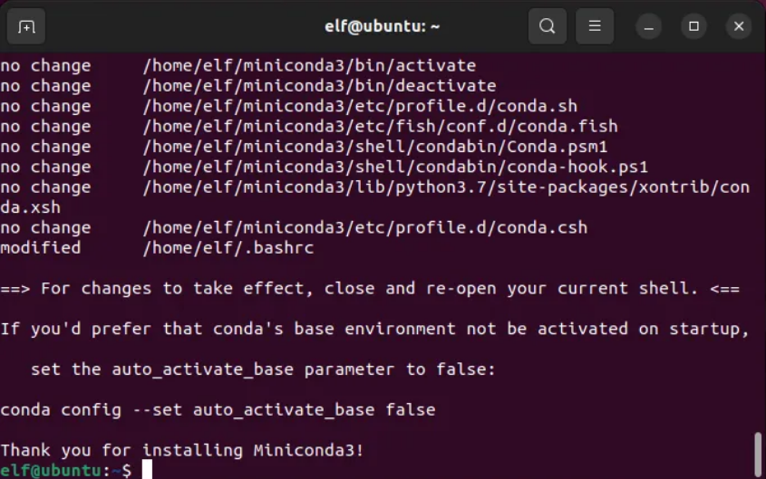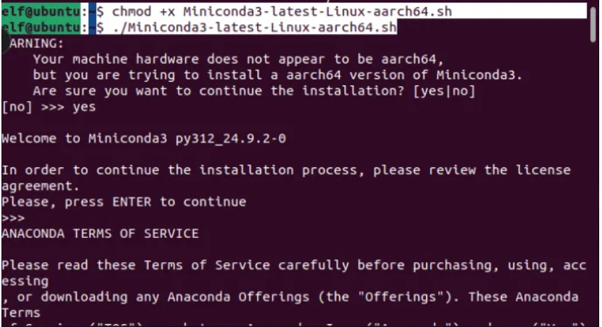 elf@ubuntu:~$?chmod +x?Miniconda3-4.7.12.1-Linux-x86_64.sh?elf@ubuntu:~$?./Miniconda3-4.7.12.1-Linux-x86_64.sh