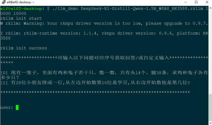 elf@elf2-desktop:~$ ./llm_demo DeepSeek-R1-Distill-Qwen-1.5B_W8A8_RK3588.rkllm?10000?10000