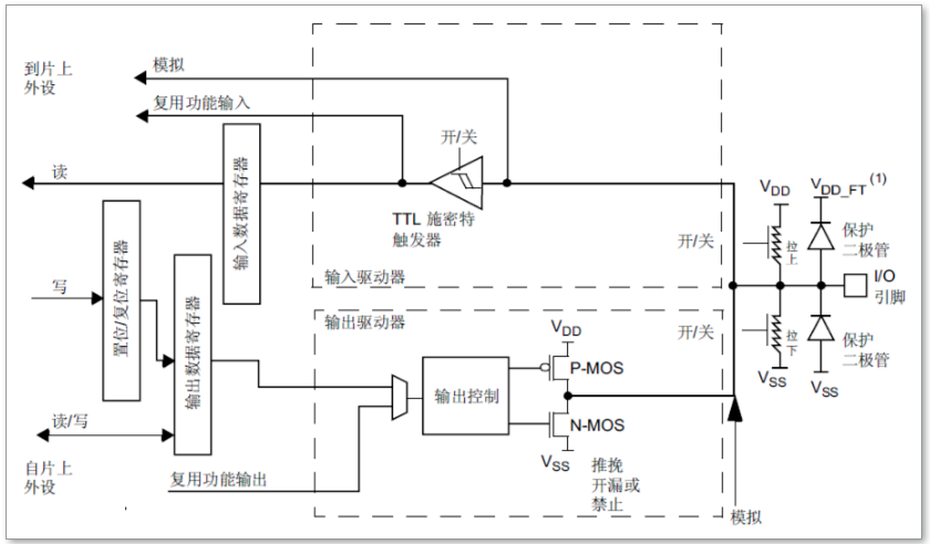 其特點(diǎn)是在空閑時(shí),IO狀態(tài)不確定,由外部環(huán)境決定。在使用浮空輸入時(shí),內(nèi)部的上拉和下拉電阻通常處于關(guān)斷狀態(tài),施密特觸發(fā)器打開,雙MOS管處于關(guān)斷狀態(tài),輸入處于高阻態(tài)。