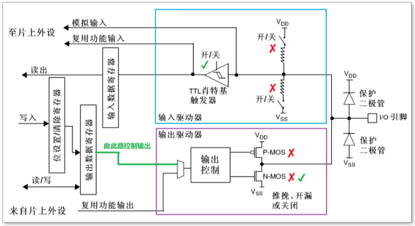 其特點(diǎn)是可以輸出高電平和低電平,并且有較強(qiáng)的驅(qū)動(dòng)能力。使用推挽輸出,電路內(nèi)部的上拉電阻和下拉電阻通常處于關(guān)斷狀態(tài),施密特觸發(fā)器打開,NMOS管和PMOS管由內(nèi)部寄存器控制導(dǎo)通或者不導(dǎo)通的狀態(tài)。?