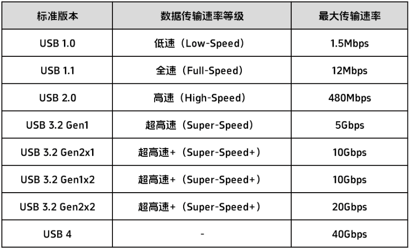 自1996年USB-IF(USB Implementers Forum)組織發(fā)布USB 1.0標準以來,USB標準經(jīng)歷了USB 1.1、USB 2.0、USB 3.0、USB 3.1、USB 3.2多個版本的發(fā)展。下面就簡單了解一下各個版本的協(xié)議。