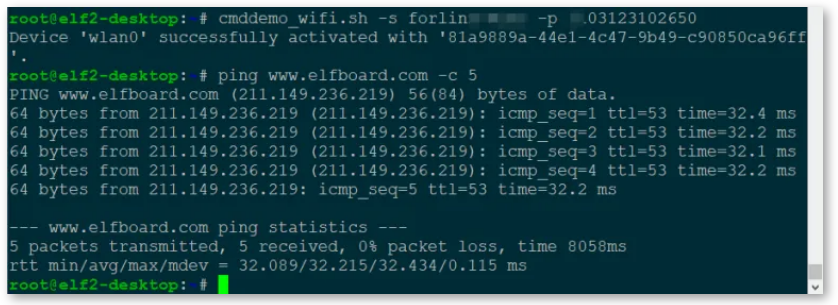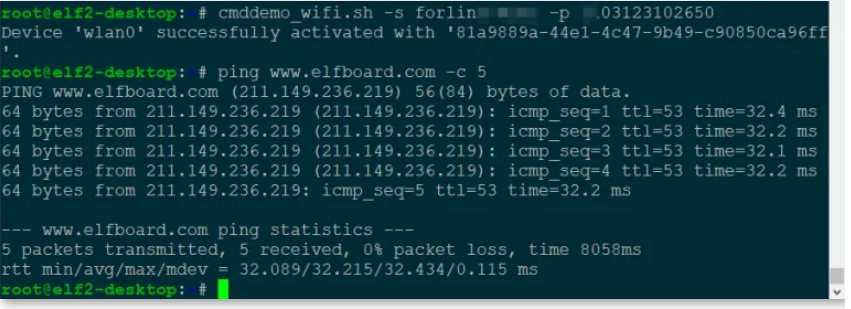 root@elf2-desktop:~# cp /run/media/sda1/cmddemo_wifi.sh /usr/bin///root@elf2-desktop:~# cmddemo_wifi.sh -s SSID -p password?//SSID:熱點(diǎn)名稱; password:熱點(diǎn)密碼。root@elf2-desktop:~# cmddemo_wifi.sh -s forlinx -p 03123102650Device?'wlan0'?successfully activated?with?'81a9889a-44e1-4c47-9b49-c90850ca96ff'.//撥號成功之后ping下elfboard官網(wǎng),能ping通說明WiFi可以正常使用root@elf2-desktop:~# ping www.51meinv.cn -c 5PING www.51meinv.cn (211.149.236.219)?56(84)?bytes?of data.64?bytes?from?211.149.236.219?(211.149.236.219): icmp_seq=1?ttl=53?time=32.2?ms64?bytes?from?211.149.236.219?(211.149.236.219): icmp_seq=2?ttl=53?time=32.0?ms64?bytes?from?211.149.236.219?(211.149.236.219): icmp_seq=3?ttl=53?time=32.0?ms64?bytes?from?211.149.236.219?(211.149.236.219): icmp_seq=4?ttl=53?time=31.9?ms64?bytes?from?211.149.236.219?(211.149.236.219): icmp_seq=5?ttl=53?time=32.3?ms--- www.51meinv.cn ping statistics ---5?packets transmitted,?5?received,?0% packet loss, time 4005msrtt?min/avg/max/mdev =?31.948/32.074/32.266/0.140?ms