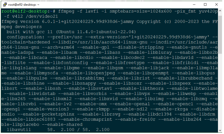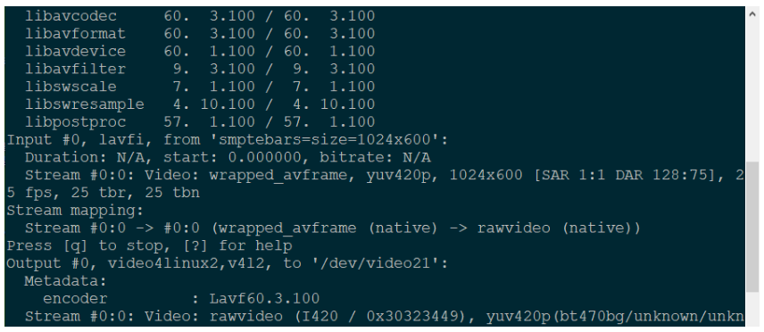 root@elf2-desktop:~# ffmpeg -f lavfi -i smptebars=size=1024x600 -pix_fmt yuv420p -f v4l2 /dev/video21