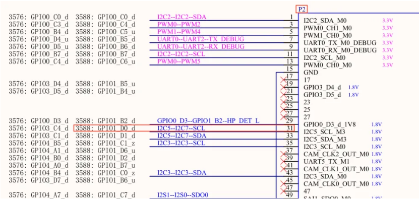 P2_31引腳對應開發(fā)板功能:I2C5--I2C7--SCL(左側(cè)I2C5為3576開發(fā)板引腳功能,右側(cè)I2C7為ELF2板卡引腳功能)。