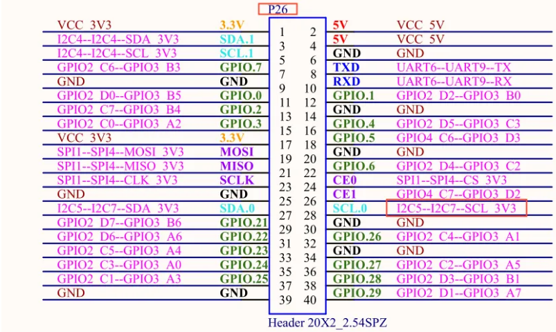 I2C5--I2C7--SCL(P2_31引腳對應的網(wǎng)絡標號)對應開發(fā)板P26接口的32引腳。