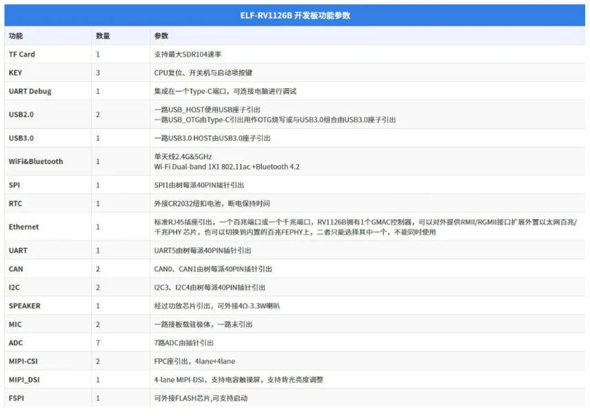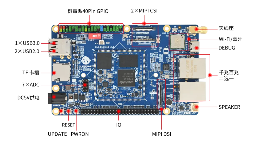 ELF-RV1126B開(kāi)發(fā)板采用120mm×75mm的緊湊尺寸,易于攜帶與實(shí)驗(yàn)操作。盡管體積小巧,它仍提供了豐富的外設(shè)接口資源,包括2路網(wǎng)口,MIPI-DSI和RGB LCD顯示接口,USB、WiFi等常用接口,并且設(shè)計(jì)了與樹(shù)莓派40pinGPIO同定義的引腳,助力項(xiàng)目的開(kāi)發(fā)。