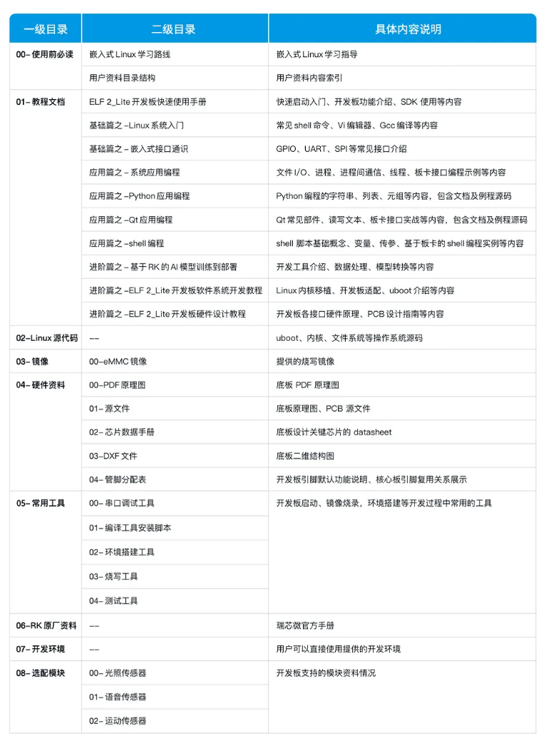 ELF 2_Lite開發(fā)板配套提供了豐富的課程資料,系統(tǒng)且全面地覆蓋了嵌入式Linux開發(fā)與嵌入式AI開發(fā)的全流程。其中嵌入式Linux開發(fā)資料提供系統(tǒng)化的學(xué)習(xí)路線,幫助高校師生和個人學(xué)習(xí)者快速構(gòu)建知識體系并上手實踐。嵌入式AI開發(fā)資料聚焦從模型訓(xùn)練適配到板端部署落地的核心鏈路,提供從理論到實踐的完整支持。資料通過項目實戰(zhàn),帶領(lǐng)新手完成從數(shù)據(jù)處理、模型訓(xùn)練、模型轉(zhuǎn)換到板端模型部署與推理的全流程實操,助力嵌入式AI項目快速實現(xiàn)落地。