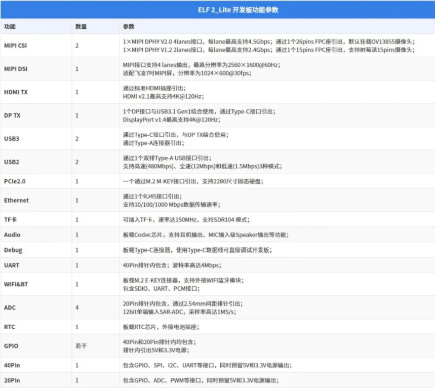 同時,為了滿足用戶多樣化的外接需求,ELF 2_Lite開發(fā)板還適配了顯示屏、攝像頭、光照傳感器、運動傳感器、語音控制等選配模塊。并且,在開發(fā)板上預(yù)留的40pin排針可兼容樹莓派的各種模塊,為項目創(chuàng)新與嵌入式AI學(xué)習(xí)拓展了無限可能。