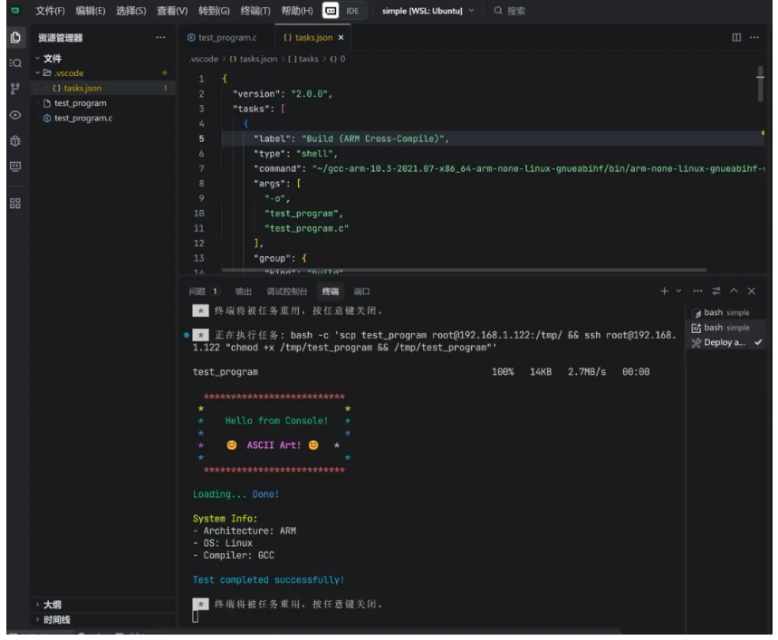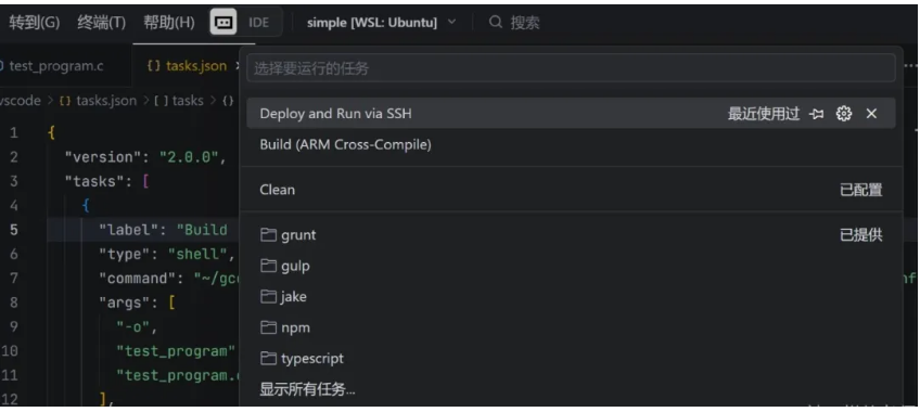 {??"version":?"2.0.0",??"tasks": [? ? {? ? ??"label":?"Build (ARM Cross-Compile)",? ? ??"type":?"shell",? ? ??"command":?"~/gcc-arm-10.3-2021.07-x86_64-arm-none-linux-gnueabihf/bin/arm-none-linux-gnueabihf-gcc",? ? ??"args": [? ? ? ??"-o",? ? ? ??"test_program",? ? ? ??"test_program.c"? ? ? ],? ? ??"group": {? ? ? ??"kind":?"build",? ? ? ??"isDefault":?true? ? ? },? ? ??"presentation": {? ? ? ??"echo":?true,? ? ? ??"reveal":?"always",? ? ? ??"focus":?false,? ? ? ??"panel":?"shared",? ? ? ??"showReuseMessage":?true,? ? ? ??"clear":?false? ? ? },? ? ??"problemMatcher": [? ? ? ??"$gcc"? ? ? ]? ? },? ? {? ? ??"label":?"Clean",? ? ??"type":?"shell",? ? ??"command":?"rm",? ? ??"args": [? ? ? ??"-f",? ? ? ??"test_program"? ? ? ],? ? ??"presentation": {? ? ? ??"echo":?true,? ? ? ??"reveal":?"always",? ? ? ??"focus":?false,? ? ? ??"panel":?"shared",? ? ? ??"showReuseMessage":?true,? ? ? ??"clear":?false? ? ? },? ? ??"problemMatcher": []? ? },? ? {? ? ??"label":?"Deploy and Run via SSH",? ? ??"type":?"shell",? ? ??"dependsOn": ["Build (ARM Cross-Compile)"],? ? ??"command":?"bash",? ? ??"args": [? ? ? ??"-c",? ? ? ??"scp test_program root@192.168.1.122:/tmp/ && ssh root@192.168.1.122?\"chmod +x /tmp/test_program && /tmp/test_program\""? ? ? ],? ? ??"presentation": {? ? ? ??"echo":?true,? ? ? ??"reveal":?"always",? ? ? ??"focus":?true,? ? ? ??"panel":?"shared",? ? ? ??"showReuseMessage":?true,? ? ? ??"clear":?false? ? ? },? ? ??"problemMatcher": []? ? }? ]}