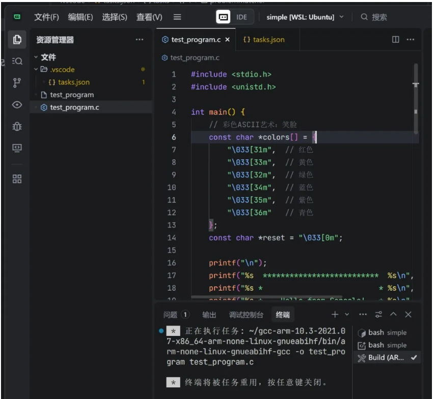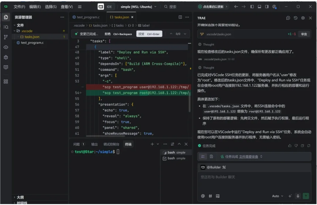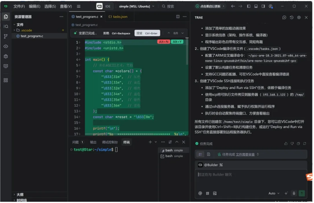 TRAE開始勤奮的工作,開始生成C程序代碼(test_program.c)和任務(wù)代碼(task.json)。