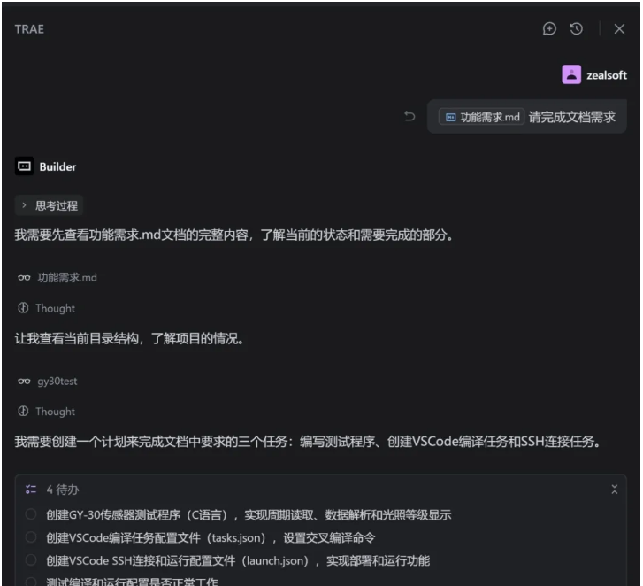 TRAE會自動分析我們的需求,根據(jù)分析結果確定任務,并開始執(zhí)行。中間有幾個步驟需要人工確認,但很快就能輸出正確結果。