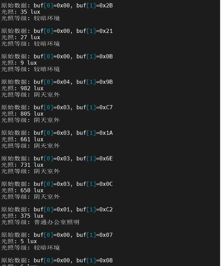 ???????I2C_DEVICE?"/dev/i2c-2"?SENSOR_ADDR?0x23?CONTINUOUS_HIGH_RES_MODE?0x10int?main()?{? ??int?i2c_fd =?open(I2C_DEVICE, O_RDWR);? ??if?(i2c_fd 0) {? ? ? ??perror("無法打開I2C設備");? ? ? ??return?1;? ? }? ??if?(ioctl(i2c_fd, I2C_SLAVE, SENSOR_ADDR) 0) {? ? ? ??perror("無法設置I2C從設備地址");? ? ? ??close(i2c_fd);? ? ? ??return?1;? ? }? ??unsigned?char?mode_cmd = CONTINUOUS_HIGH_RES_MODE;? ??if?(write(i2c_fd, &mode_cmd,?1) !=?1) {? ? ? ??perror("無法設置傳感器模式");? ? ? ??close(i2c_fd);? ? ? ??return?1;? ? }? ??usleep(180000);? ??printf("GY-30傳感器測試程序已啟動\n");? ??printf("按Ctrl+C退出\n\n");? ??while?(1) {? ? ? ??unsigned?char?buf[2];? ? ? ??if?(read(i2c_fd, buf,?2) !=?2) {? ? ? ? ? ??perror("讀取傳感器數(shù)據(jù)失敗");? ? ? ? ? ??break;? ? ? ? }? ? ? ??printf("原始數(shù)據(jù): buf[0]=0x%02X, buf[1]=0x%02X\n", buf[0], buf[1]);? ? ? ??int?lux = (buf[0] <8) | buf[1];? ? ? ? lux = (int)(lux /?1.2);? ? ? ??printf("光照: %d lux\n", lux);? ? ? ??if?(lux >=?10000?&& lux <=?20000) {? ? ? ? ? ??printf("光照等級: 晴天室外陰影處\n");? ? ? ? }?else?if?(lux >=?1000?&& lux <=?3000) {? ? ? ? ? ??printf("光照等級: 室內強光照射\n");? ? ? ? }?else?if?(lux >=?500?&& lux <=?1000) {? ? ? ? ? ??printf("光照等級: 陰天室外\n");? ? ? ? }?else?if?(lux >=?300?&& lux <=?500) {? ? ? ? ? ??printf("光照等級: 普通辦公室照明\n");? ? ? ? }?else?if?(lux 300) {? ? ? ? ? ??printf("光照等級: 較暗環(huán)境\n");? ? ? ? }?else?{? ? ? ? ? ??printf("光照等級: 極強光照\n");? ? ? ? }? ? ? ??printf("\n");? ? ? ??sleep(1);? ? }? ??close(i2c_fd);? ??return?0;}
