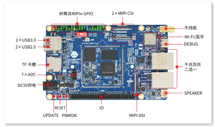 ELF-RV1126B開發(fā)板采用120mm×75mm的緊湊尺寸,易于攜帶與實驗操作。盡管體積小巧,它仍提供了豐富的外設(shè)接口資源,包括2路網(wǎng)口,MIPI-DSI和RGB LCD顯示接口,USB、WiFi等常用接口,并且設(shè)計了與樹莓派40pinGPIO同定義的引腳,助力項目的開發(fā)。